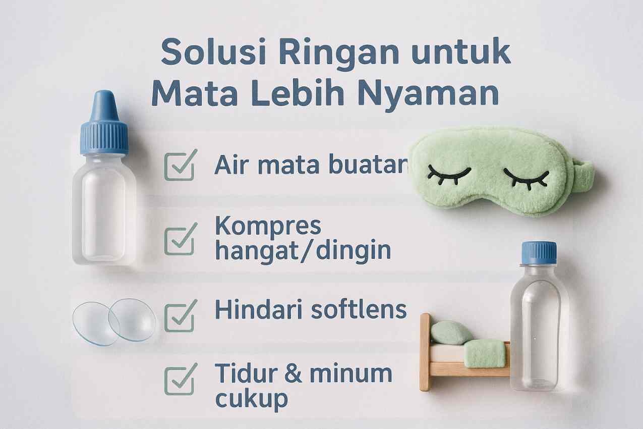 - Gunakan tetes mata buatan (artificial tears) – Membantu melembapkan mata dan mengurangi rasa perih.