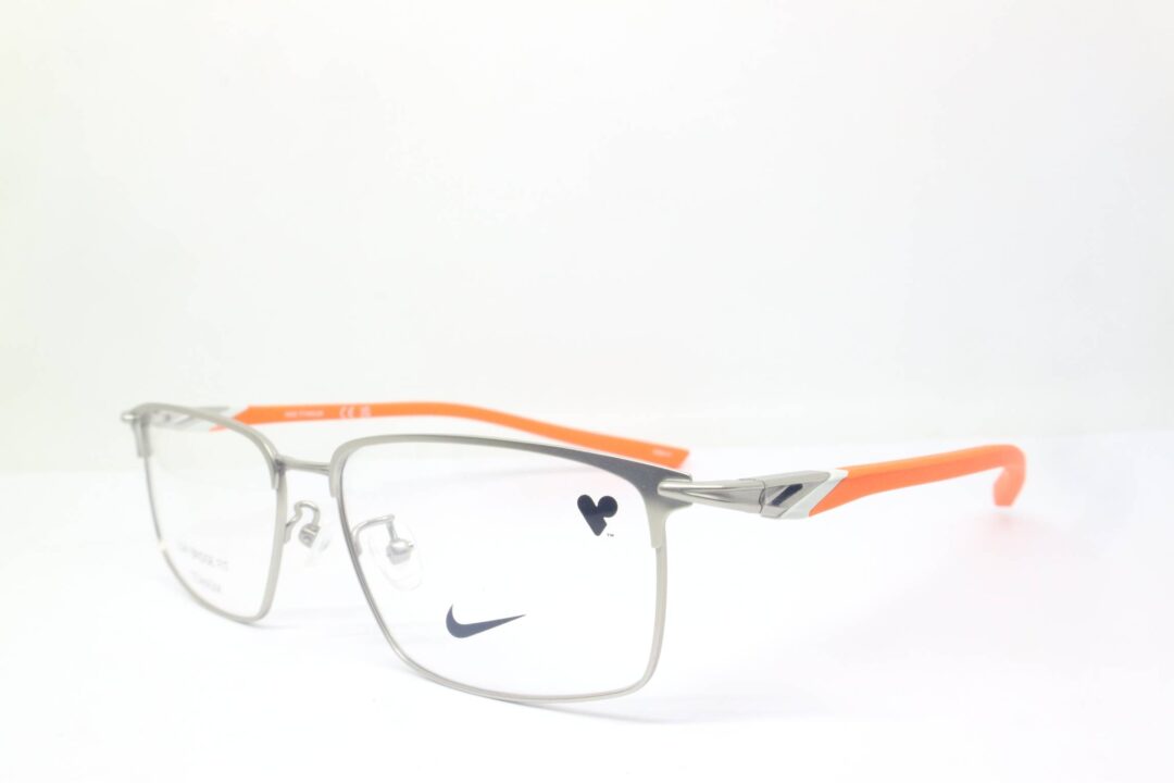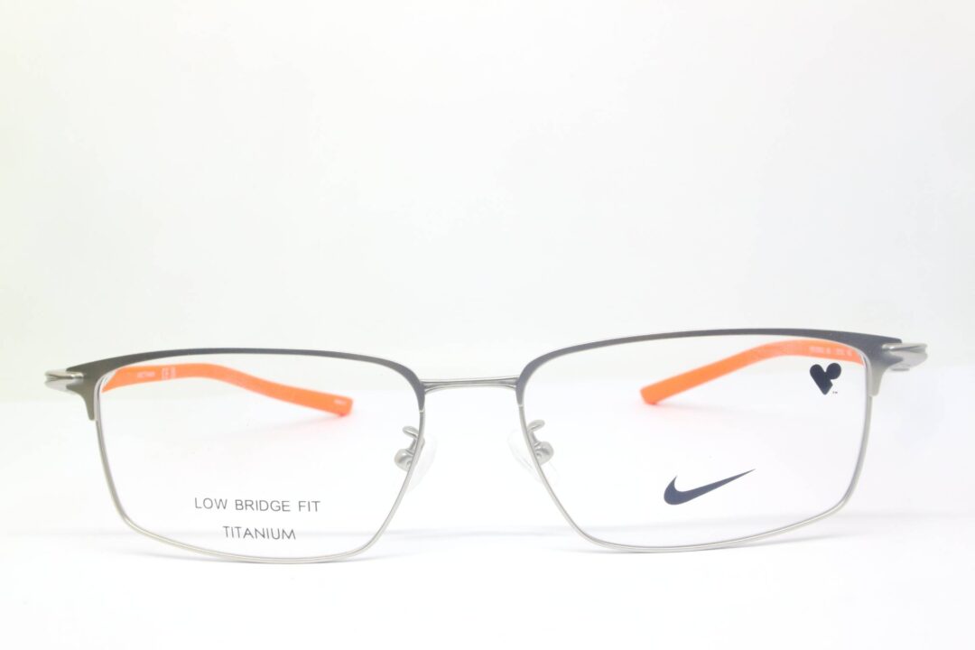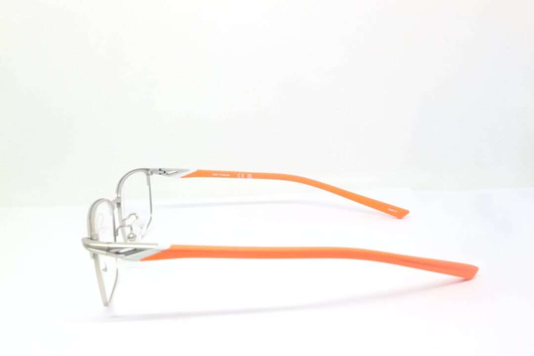 Frame Kacamata Branded Nike 6085LB 045 dengan frame titanium warna silver dan gagang orange yang sporty.
