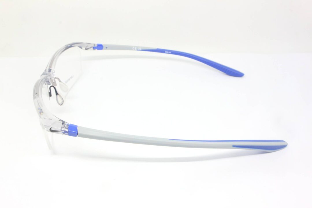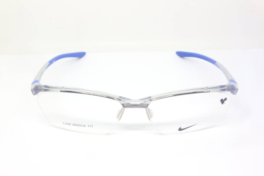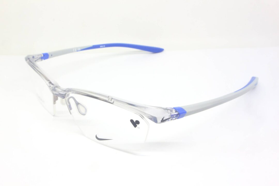 Warna light grey transparan pada frame memberikan kesan clean dan minimalis, sementara kombinasi gagang plastik warna biru–abu menambah sentuhan sporty yang khas dari desain Nike.