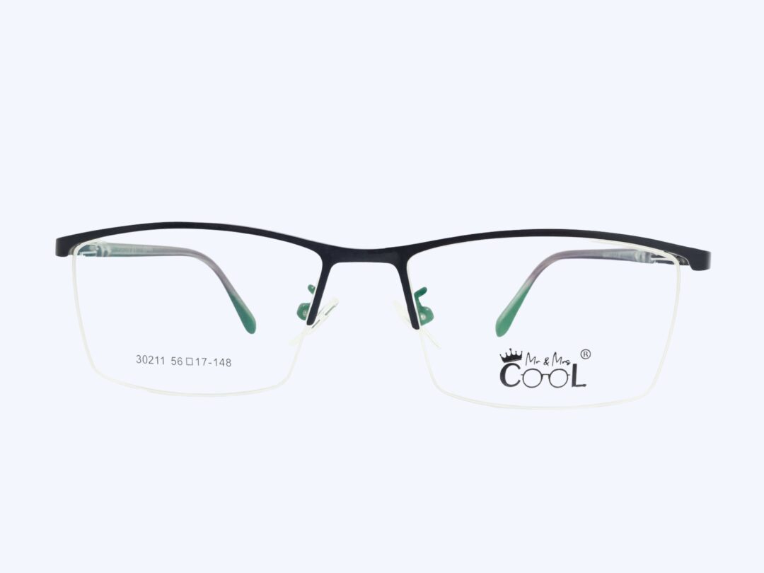 Frame Kacamata Mr&Mrs Cool 30211 C1 hadir dengan desain half frame metal berwarna hitam yang memberikan tampilan modern dan profesional.