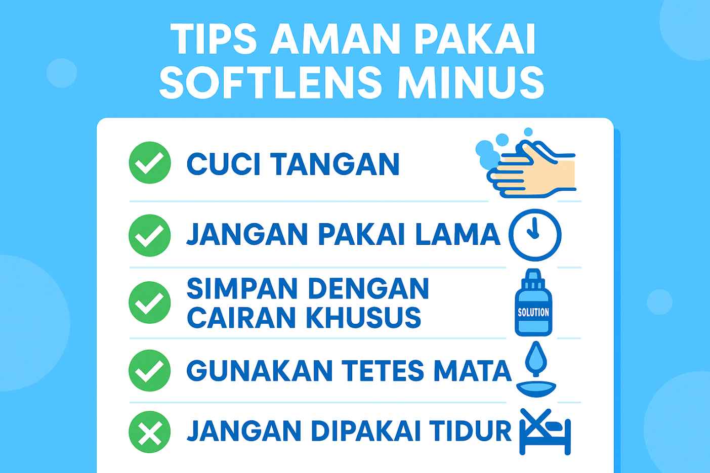 Kalau kamu pakai softlens bulanan atau tahunan, jangan pernah simpan softlens di air keran. Gunakan cairan khusus softlens (contact lens solution) yang memang dirancang untuk membersihkan dan menjaga kelembapan lensa. Cairan ini juga membantu membunuh kuman yang mungkin menempel di lensa setelah dipakai.