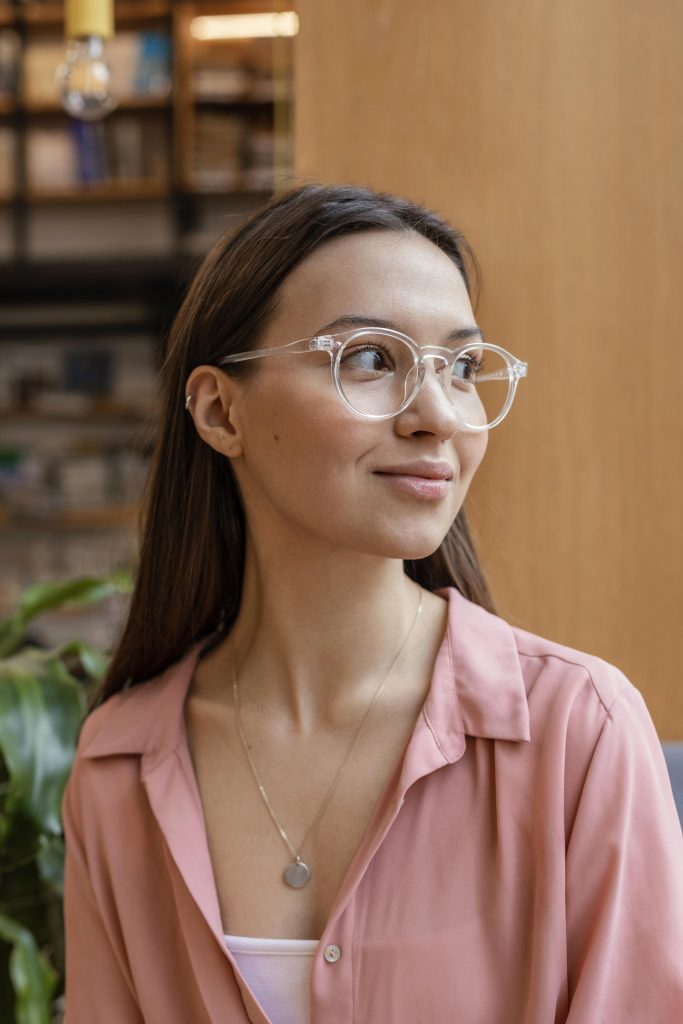 Selain itu, kacamata transparan ini juga dapat memberikan kesan anggun. Warna transparannya menciptakan tampilan yang lebih bersinar dan bersih, sehingga mampu menonjolkan riasan wajah dan fitur wajah dengan baik.